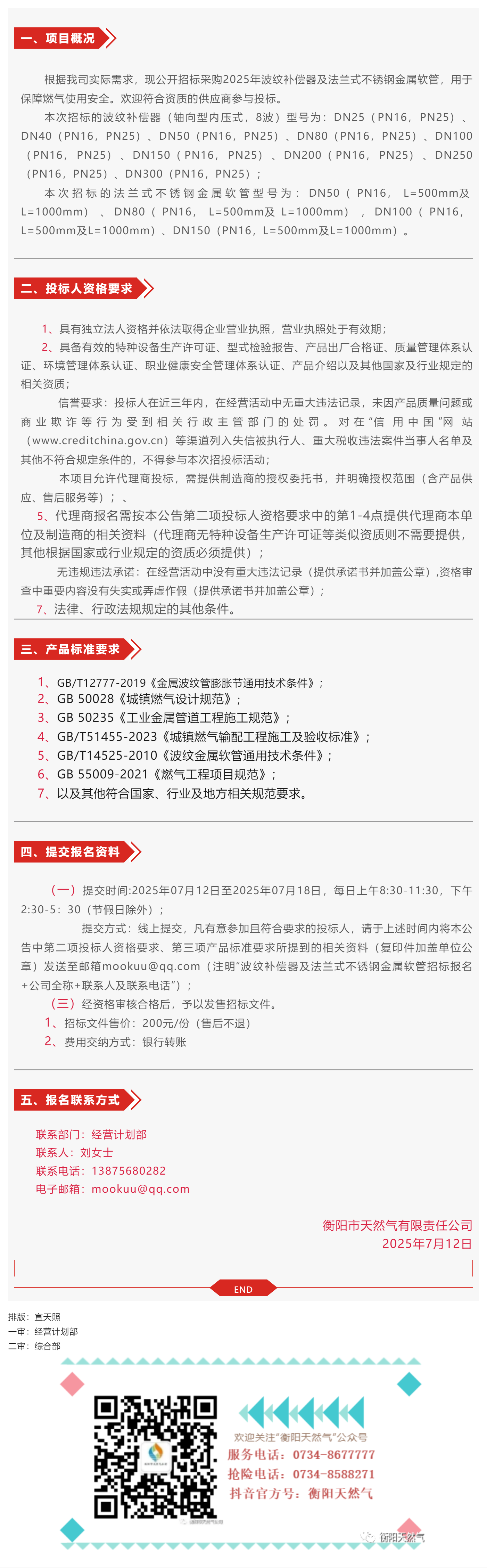 招標(biāo)公告丨衡陽(yáng)市天然氣有限責(zé)任公司2025年波紋補(bǔ)償器及法蘭式不銹鋼金屬軟管采購(gòu)招標(biāo)公告